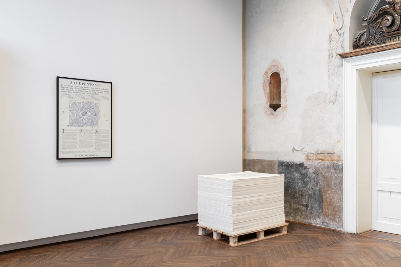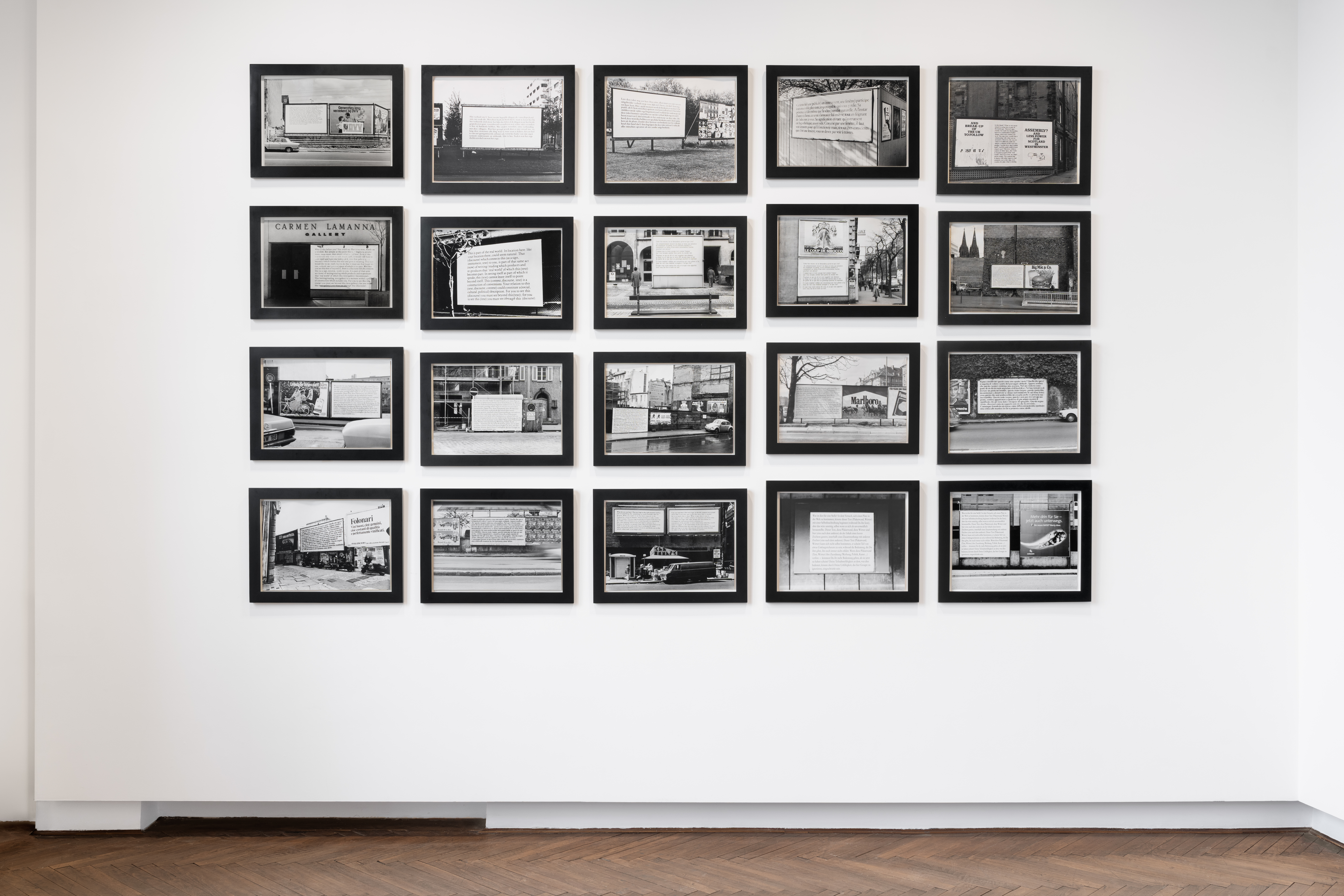 concettuale. La mostra si conclude con progetti che affrontano le questioni dell’autorialità, della fruizione e della critica istituzionale, tra cui Where Are You Standing? (1976) e Text/Context (1978–79), che documentano le incursioni anonime di Kosuth nello spazio pubblicitario urbano attraverso testi affissi su cartelloni.