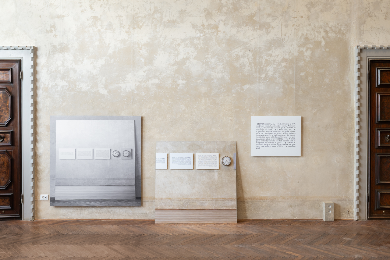 La mostra si apre con l’installazione site-specific A Chain of Resemblance, che avvolge l’atrio d’ingresso della Casa dei Tre Oci. L’opera invita lo spettatore a vedere e leggere per scoprire il testo di Michel Foucault, che l’artista ha rielaborato, e che descrive il mondo come una rete di corrispondenze e relazioni tra le specie naturali, le quali si riflettono e si influenzano reciprocamente.