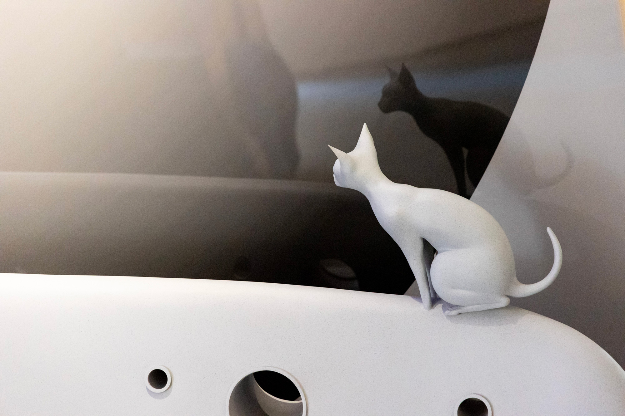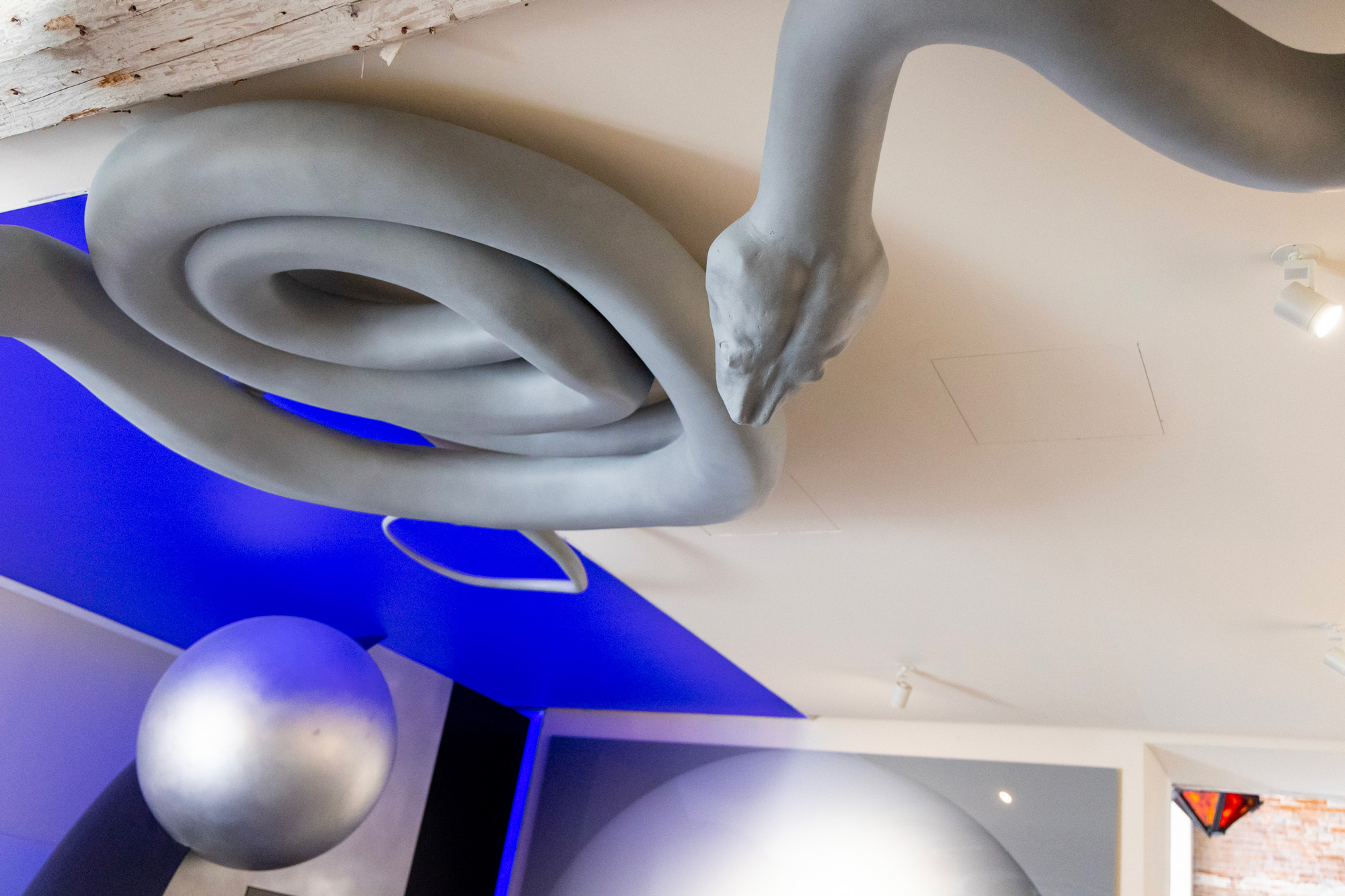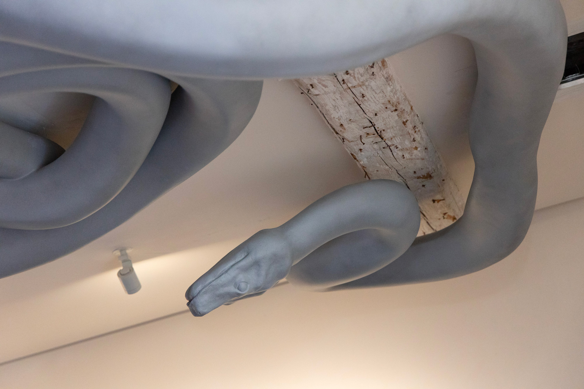 Wei, in Speculation No.2, employs a visual and cognitive hybrid language with materials and forms evocative of antiquity: the sculpture consists of a metal sphere and a hollow structure reminiscent of natural cave formations. The sketched body of a lion emerges from the cave, almost merging with the structure itself, while its form is enveloped by a snake that extends beyond the main structure into the viewer’s space.